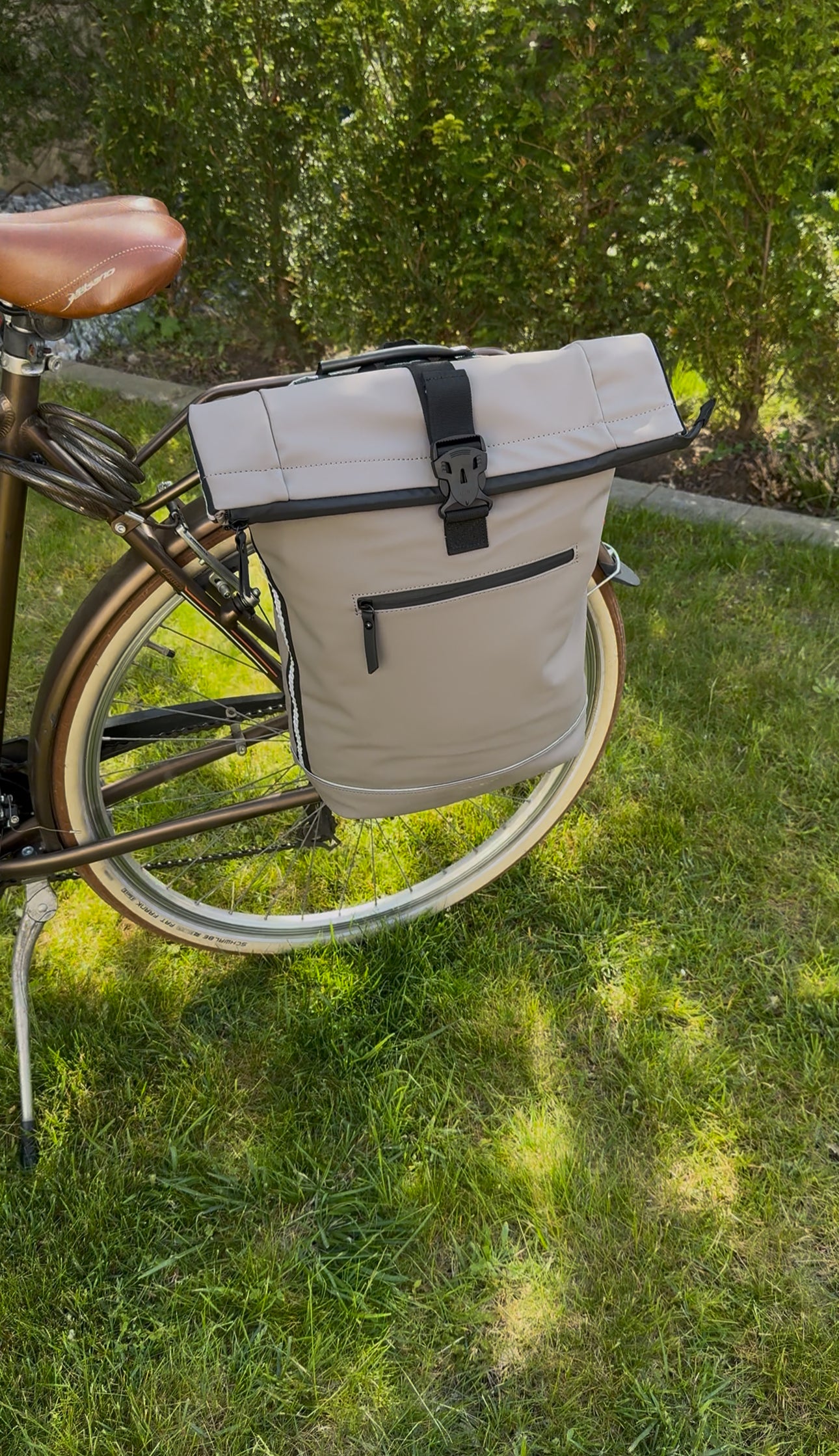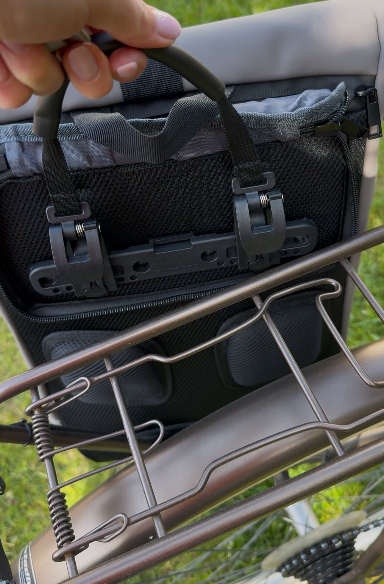 Dank der individuell einstellbaren Befestigung lässt sich der Rucksack problemlos an nahezu jeden Gepäckträger anpassen. Mit Hilfe von Distanzstücken kann der Durchmesser des Gepäckträgers genau nachempfunden werden, was für einen sicheren Halt sorgt. Zusätzlich bietet ein durchgehender Klettverschluss an der Verbindung zwischen Gepäckträger und Radaufhängung extra Stabilität während der Fahrt.