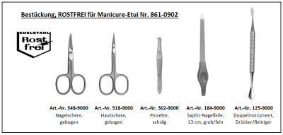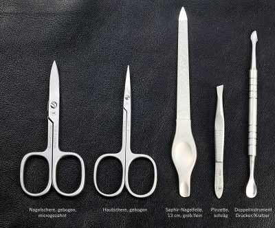 Die hochwertige Bestückung - ganz aus rostfreiem Edelstahl gearbeitet und antiallergen - umfasst folgende fünf HK-MANICURE Nagelpflege-Instrumente: