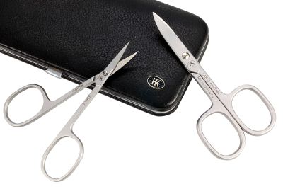 · Nagelschere, gebogen, Schließhalm; die feine Micro-Zahnung auf der einen Schneide erlaubt ein besonders präzises Arbeiten und verhindert ein "Rutschen" entlang des Nagels